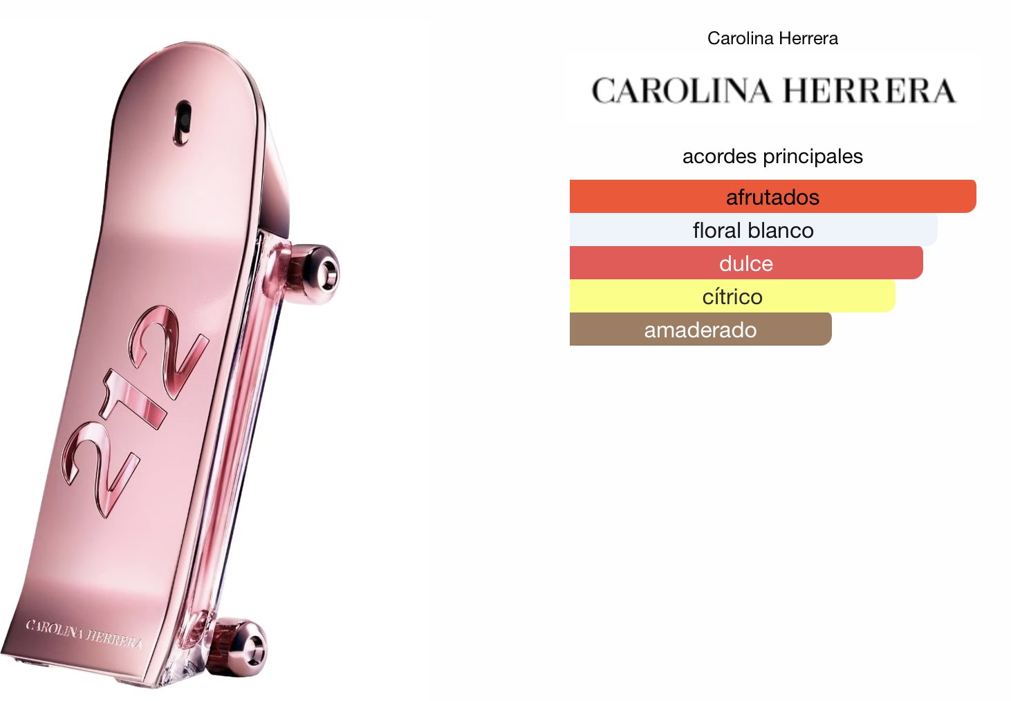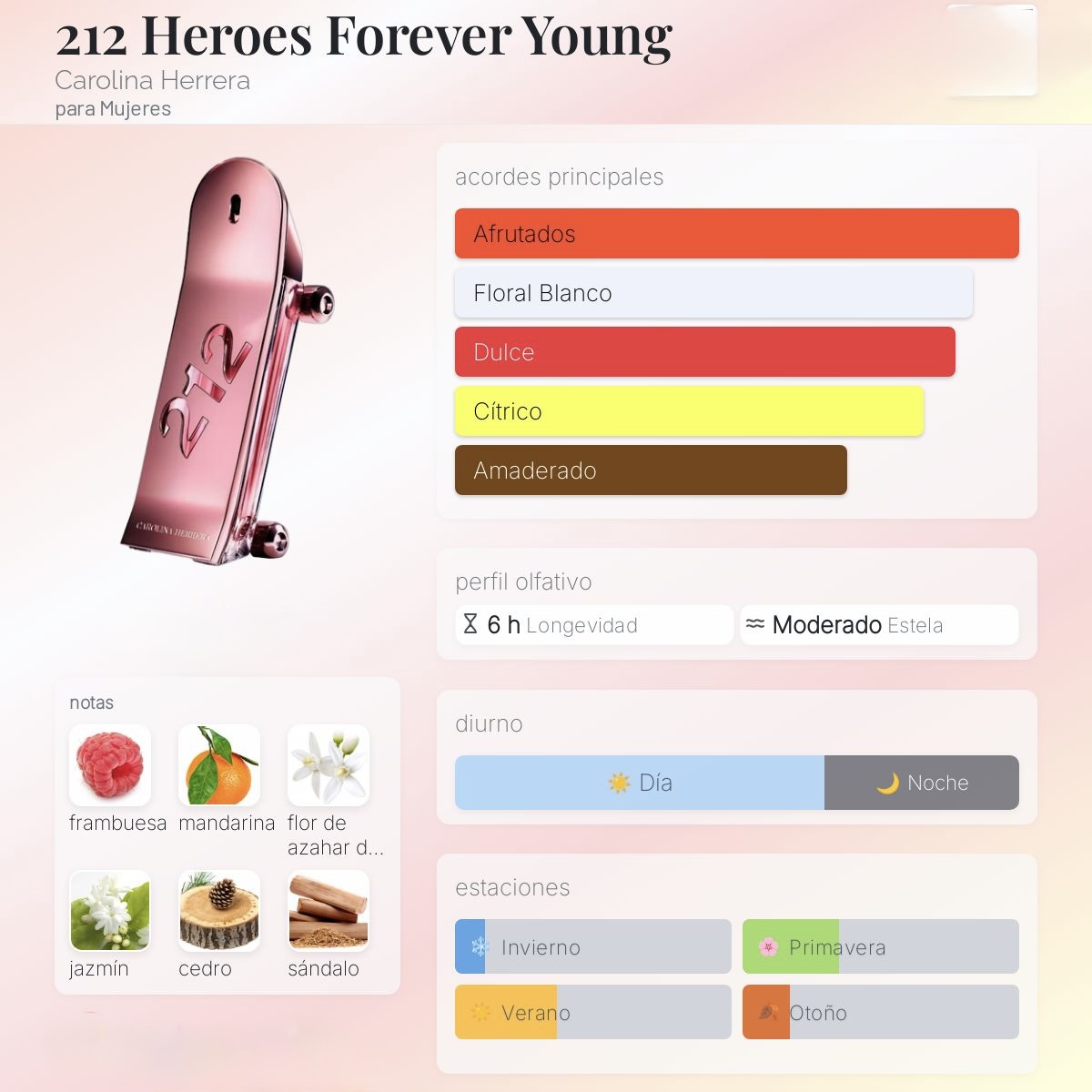 212 Heroes for her: Las Notas de Salida son frambuesa y mandarina; las Notas de Corazón son jazmín y flor de azahar del naranjo; las Notas de Fondo son cedro y sándalo.