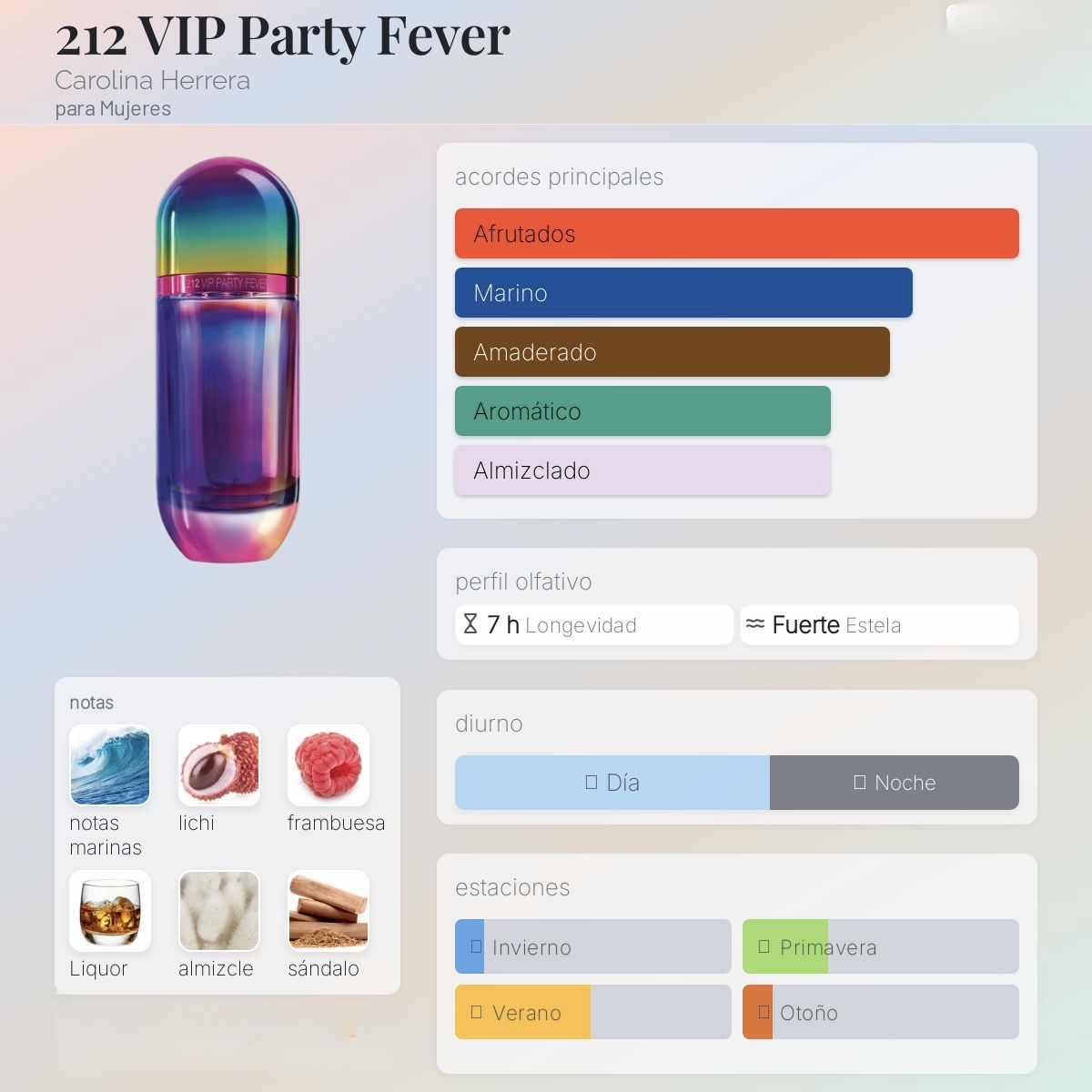 212 VIP Party Fever es una fragancia de la familia olfativa Floral Frutal para Mujeres.