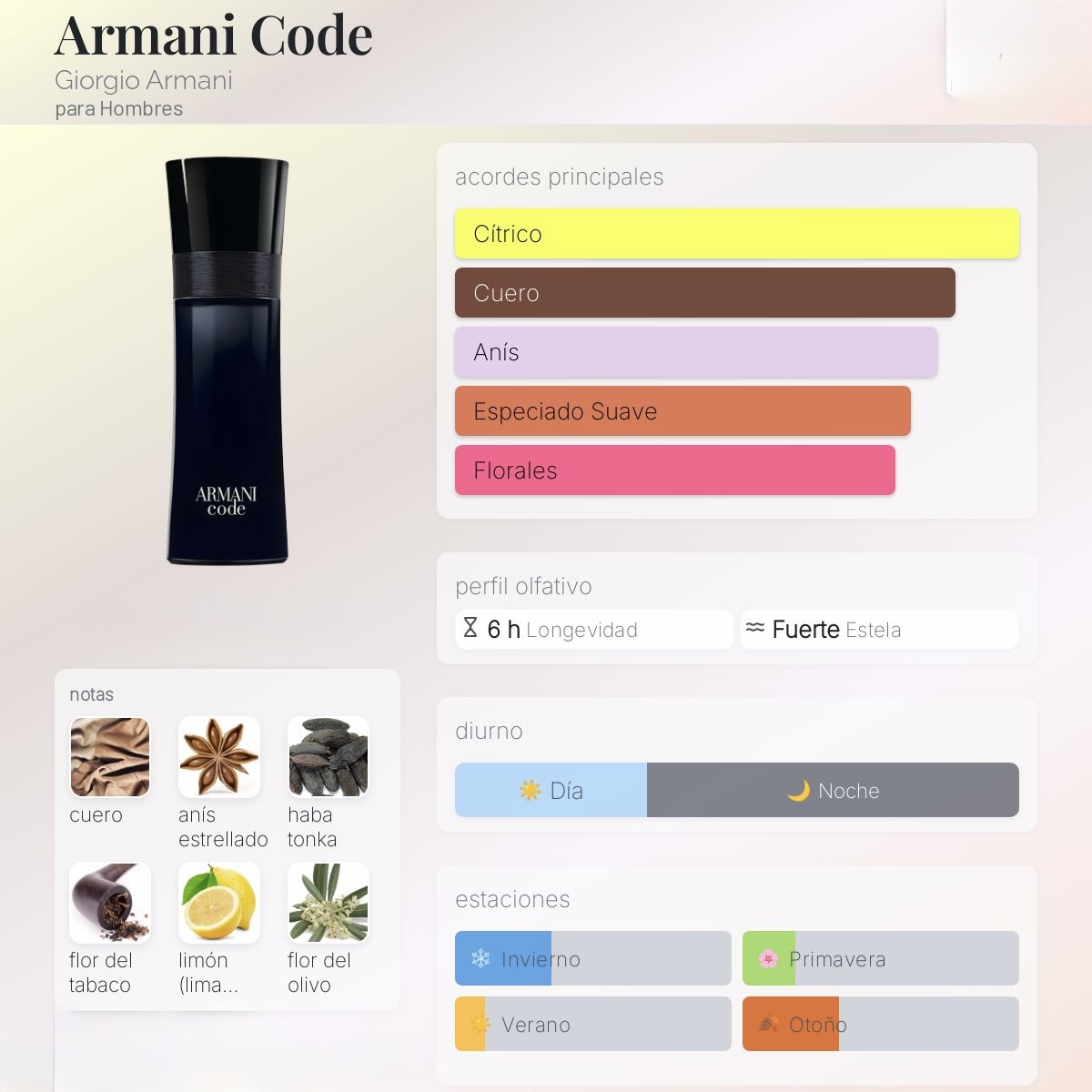 Las notas de salida combinan la frescura cítrica del limón (lima ácida) y la bergamota, que despiertan los sentidos con su vibrante energía. En el corazón, el anís estrellado, la flor del olivo y la madera de gaiac aportan un toque especiado y sofisticado que envuelve con calidez. Finalmente, las notas de fondo de cuero, haba tonka y tabaco brindan un acabado profundo y seductor, ideal para la noche y ocasiones especiales.