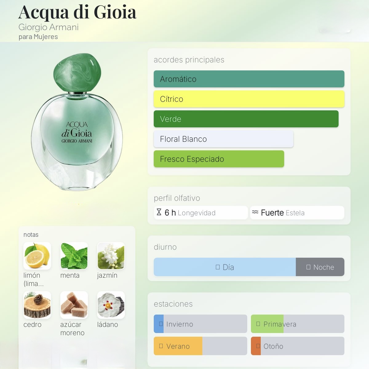 Las Notas de Salida son limón de Amalfi (lima de Amalfi) y menta; la Nota de Corazón es jazmín de agua; las Notas de Fondo son cedro de Virginia, ládano francés y azúcar moreno.