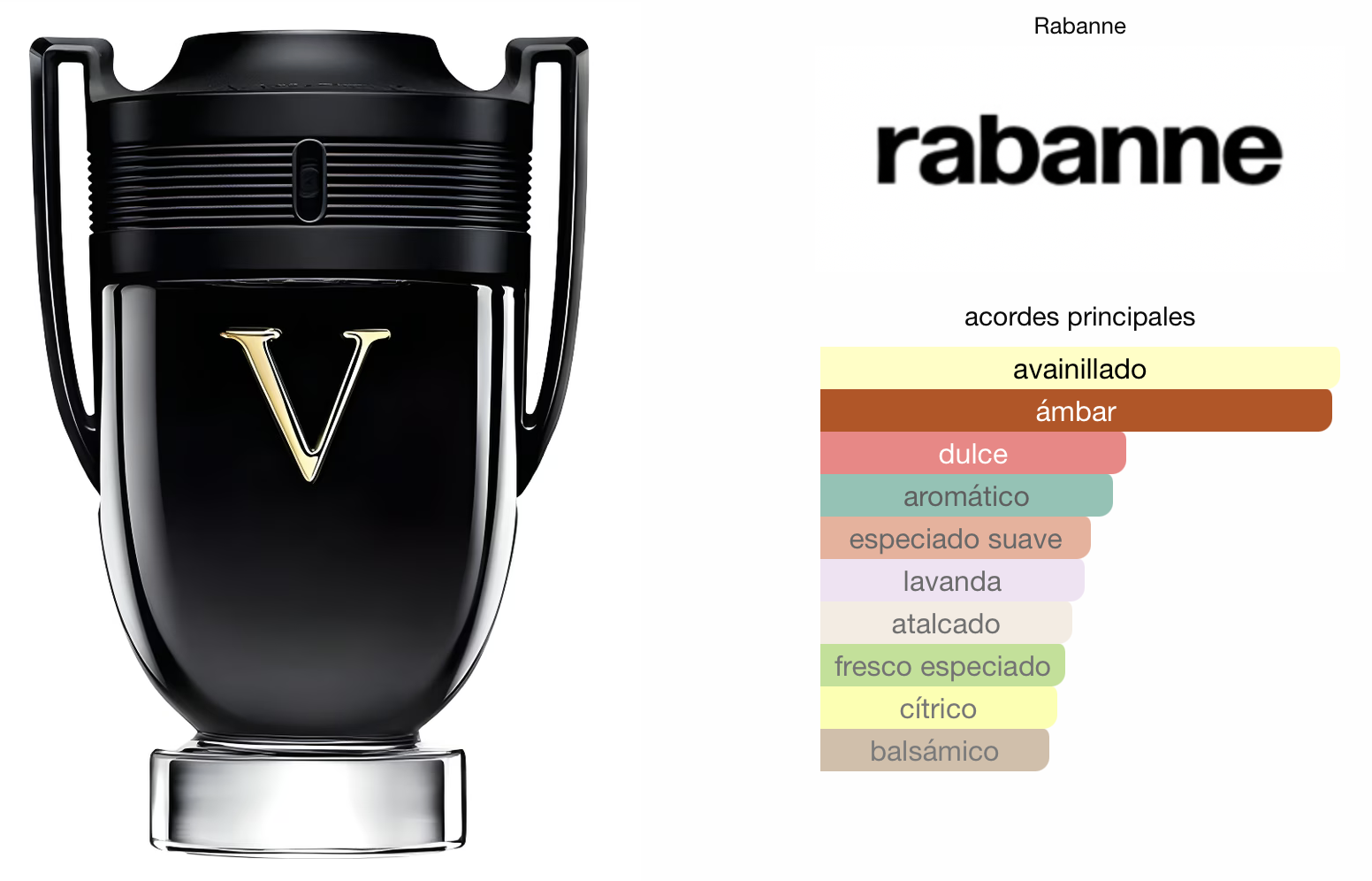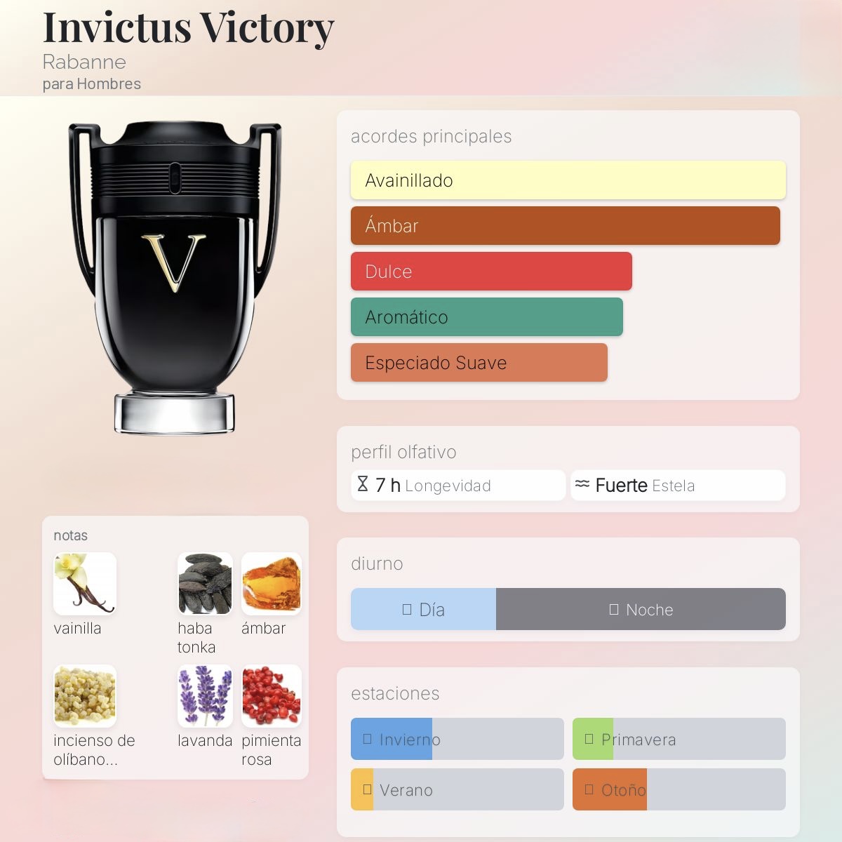 Esparta Victory type Invictus Victory es una fragancia de la familia olfativa Ámbar para Hombres. Las Notas de Salida son pimienta rosa y limón (lima ácida); las Notas de Corazón son incienso de olíbano (franquincienso) y lavanda; las Notas de Fondo son vainilla, haba tonka y ámbar.