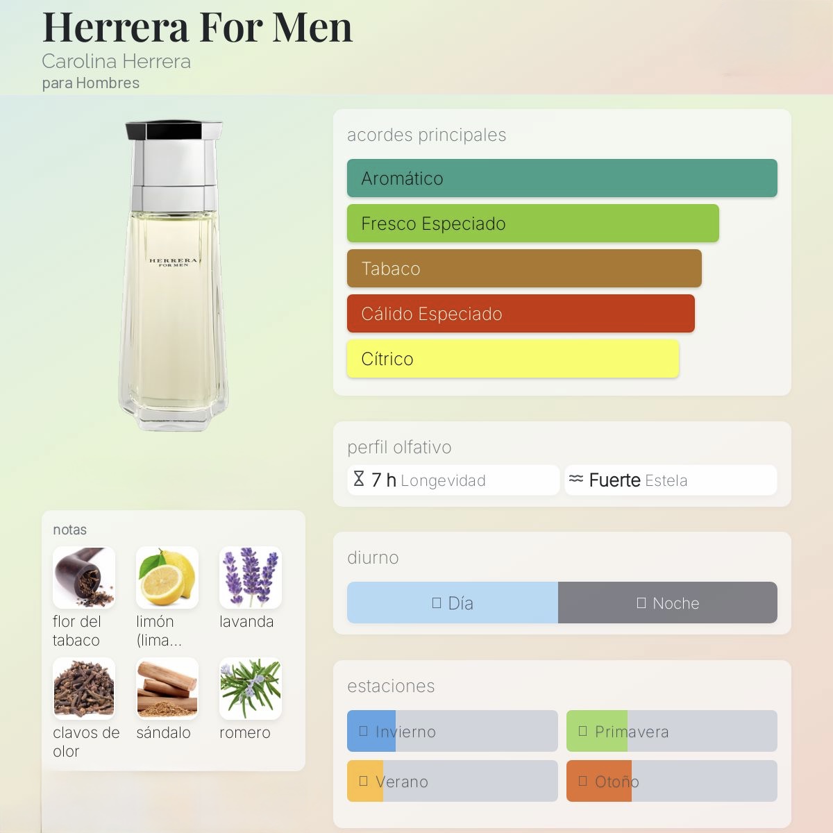 Herrera For Men de Carolina Herrera es una fragancia de la familia olfativa Almizcle Amaderado Floral para Hombres.