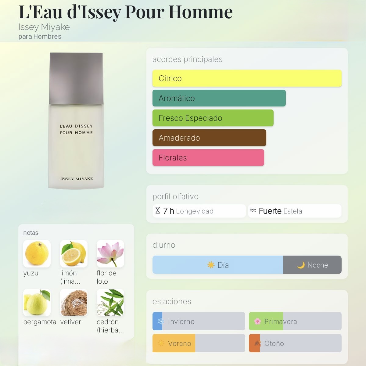 L'Eau d'Issey Pour Homme de Issey Miyake es una fragancia de la familia olfativa Amaderada Acuática para Hombres.