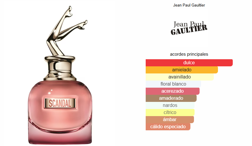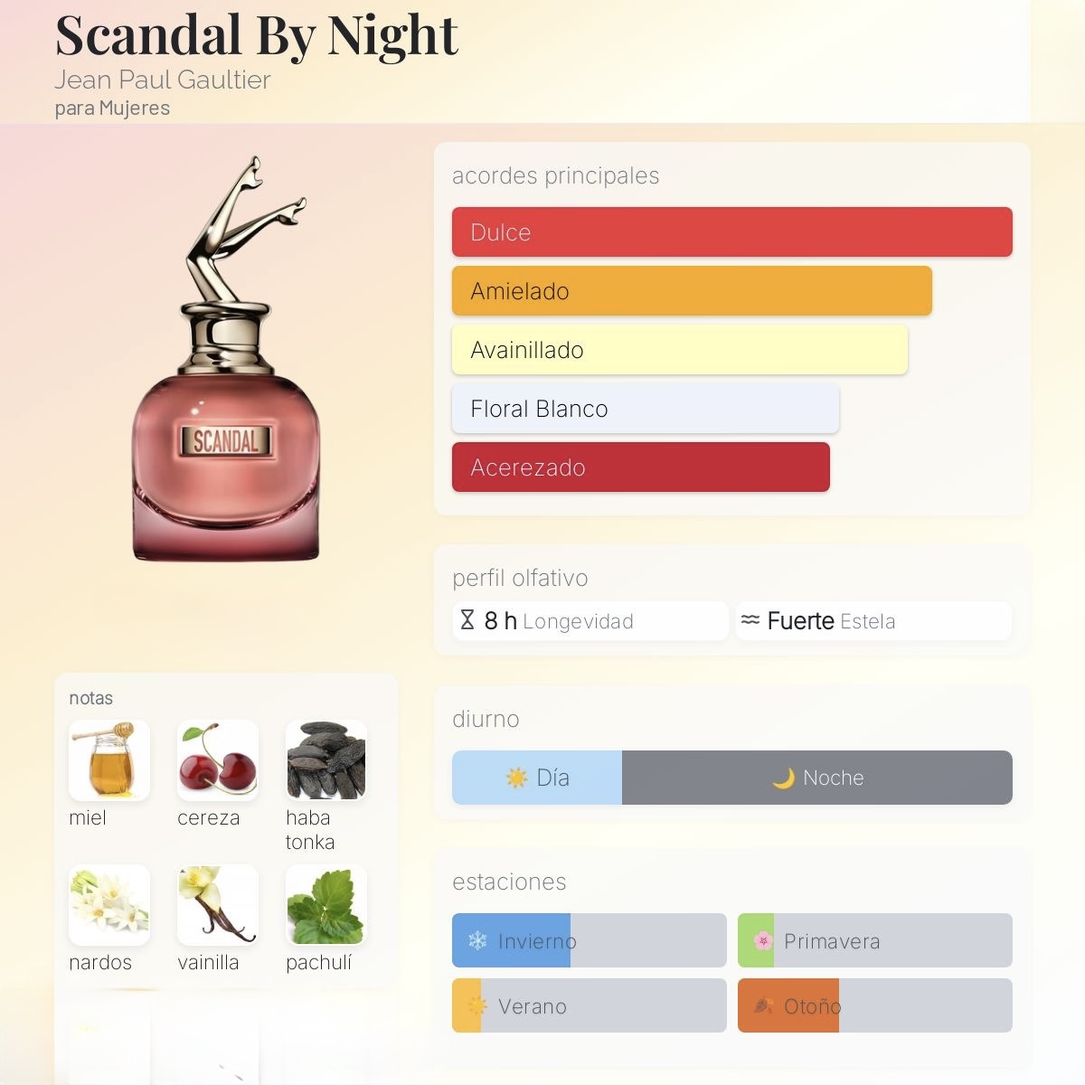 Las Notas de Salida son naranja sanguina y mandarina; las Notas de Corazón son miel, gardenia, flor de azahar del naranjo, jazmín y durazno (melocotón); las Notas de Fondo son cera de abeja, caramelo, pachulí y regaliz.
