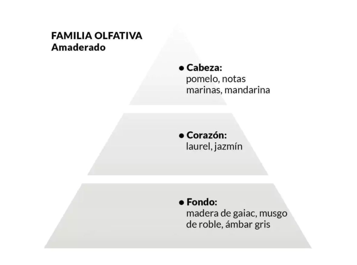 Las Notas de Salida son notas marinas, toronja (pomelo) y mandarina; las Notas de Corazón son hoja de laurel y jazmín; las Notas de Fondo son ámbar gris, madera de gaiac, musgo de roble y pachulí.