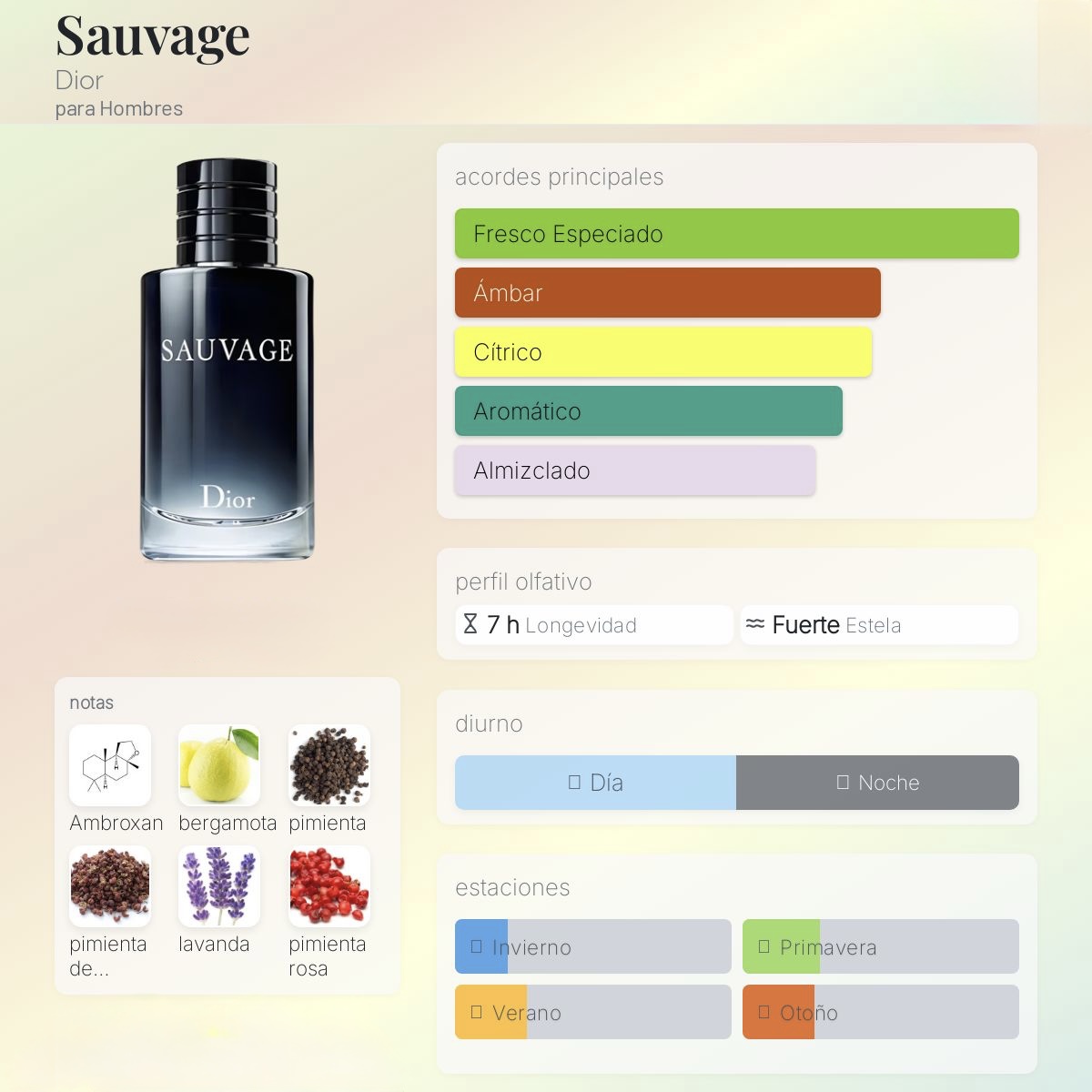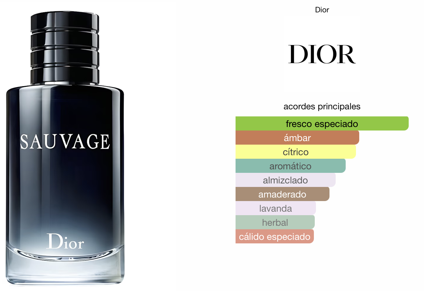 Sauvage de Dior es una fragancia de la familia olfativa Aromática Fougère para Hombres. Las Notas de Salida son bergamota de Calabria y pimienta; las Notas de Corazón son pimienta de Sichuan, lavanda, pimienta rosa, vetiver, pachulí, geranio y elemí; las Notas de Fondo son ambroxan, cedro y ládano.