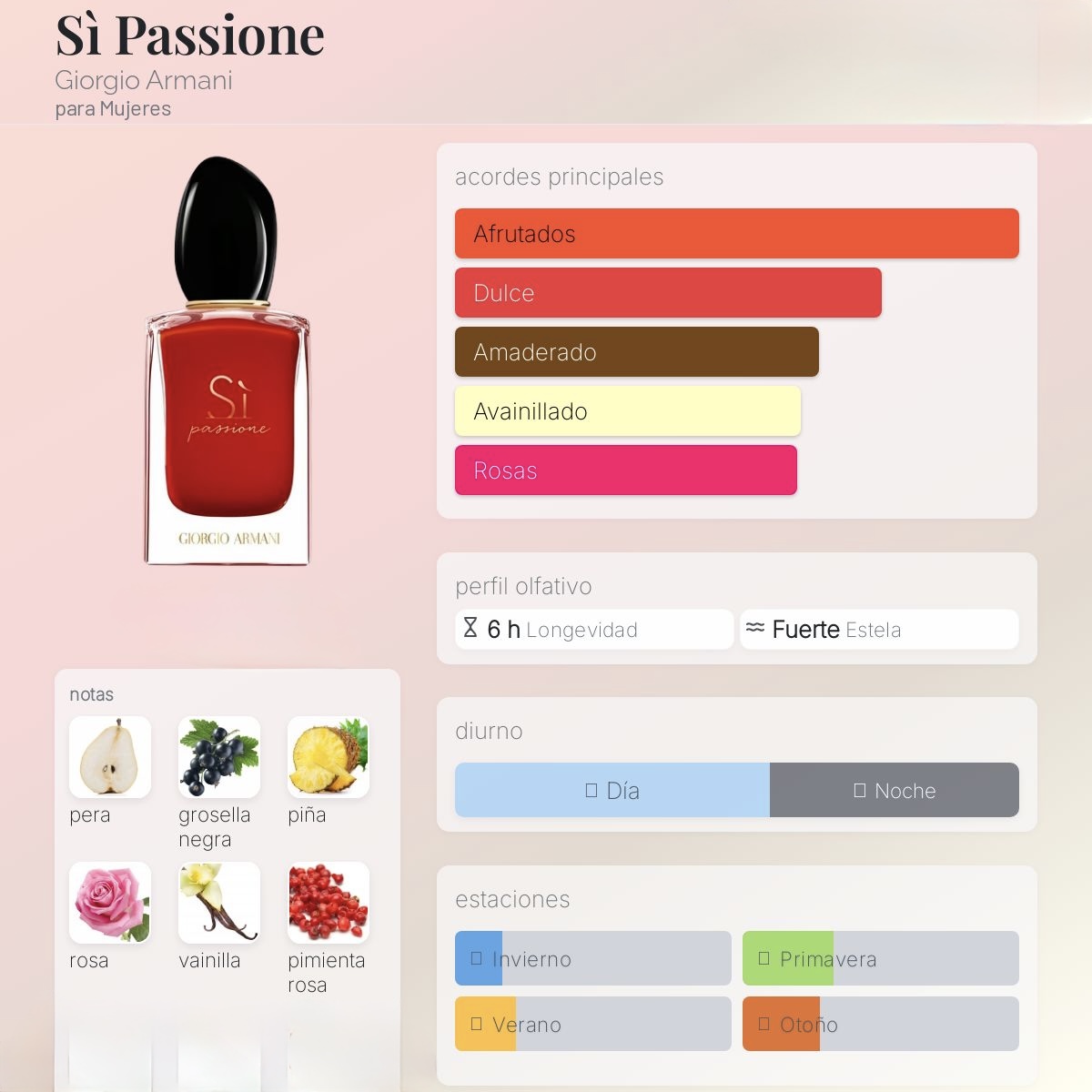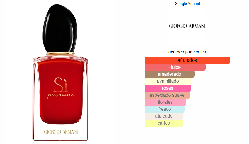Siena type Si Passione es una fragancia exquisitamente femenina que captura la esencia de la pasión y la elegancia. Inspirada en Sì Passione de Giorgio Armani, pertenece a la familia olfativa Floral Frutal, perfecta para mujeres que desean destacar con un aroma vibrante y sofisticado.